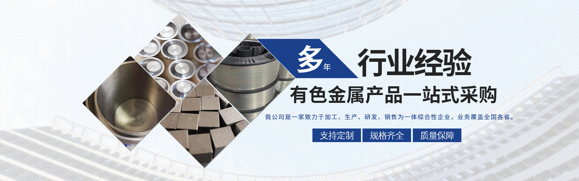 寶雞市創匯金屬材料有限公司,位于有“中國鈦谷”之稱寶雞寶鈦路南段,這里也是國家重點支持和扶持的有色金屬材料資源產業基地,我司專業從事鈦、鋯、鉿、鎳鉻、鎢鉬、鉭鈮、合金材料、復合材料,板、棒、絲、管、箔材等,設備制造,金屬制品機械加工銷售。